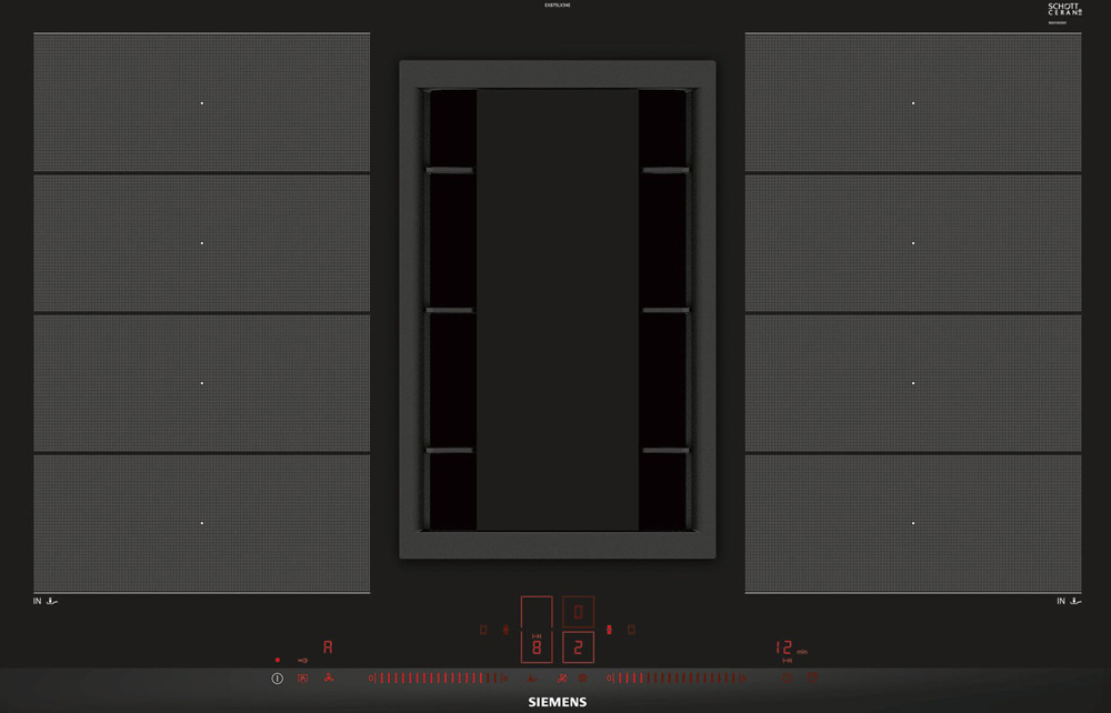 This appliance combines two technologies in one ultra-convenient appliance. With a "rangehood" - integrated downdraft ventilation - actually built into it, this is a sleek and effective option for a very minimalist kitchen aesthetic (or a compact kitchenette, for that matter). No overhead rangehoods are required here - cooking odours and steam are extracted and pushed downward. The one below is a Siemens - featuring the climateControl Sensor which is automatically able to adjust the extraction rate to match the amount of steam being produced on the cooking surface.