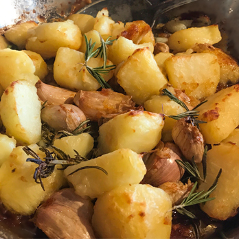In a heavy base saucepan, melt the duck fat and carefully add the par cooked potatoes, garlic cloves and rosemary.