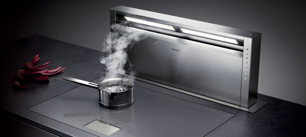 A downwhat rangehood? Well, it’s not really a “hood” at all: located at the back of a cooktop - they remain discretely out of sight until rising into a vertical position, where they draw fumes from the kitchen, before pushing them downwards to be expelled via ducting. That's a good option for those who want an absolutely streamlined kitchen design.