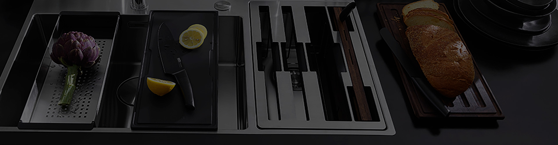 When in use, the accessories are positioned on the sink top or used on the kitchen counter. The cutting board and perforated tray fit into the main bowl with the knives close at hand. When not in use, everything fits perfectly away in a steel frame which saves space and lets them drain at the same time.