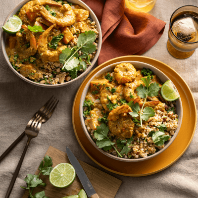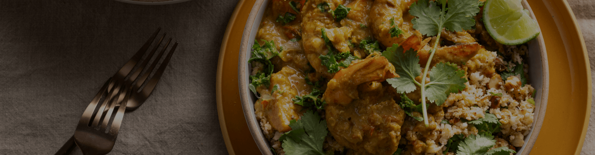 - Once the prawns are cooked, divide the curry among serving plates; serve with cauliflower rice and lime wedges on the side.