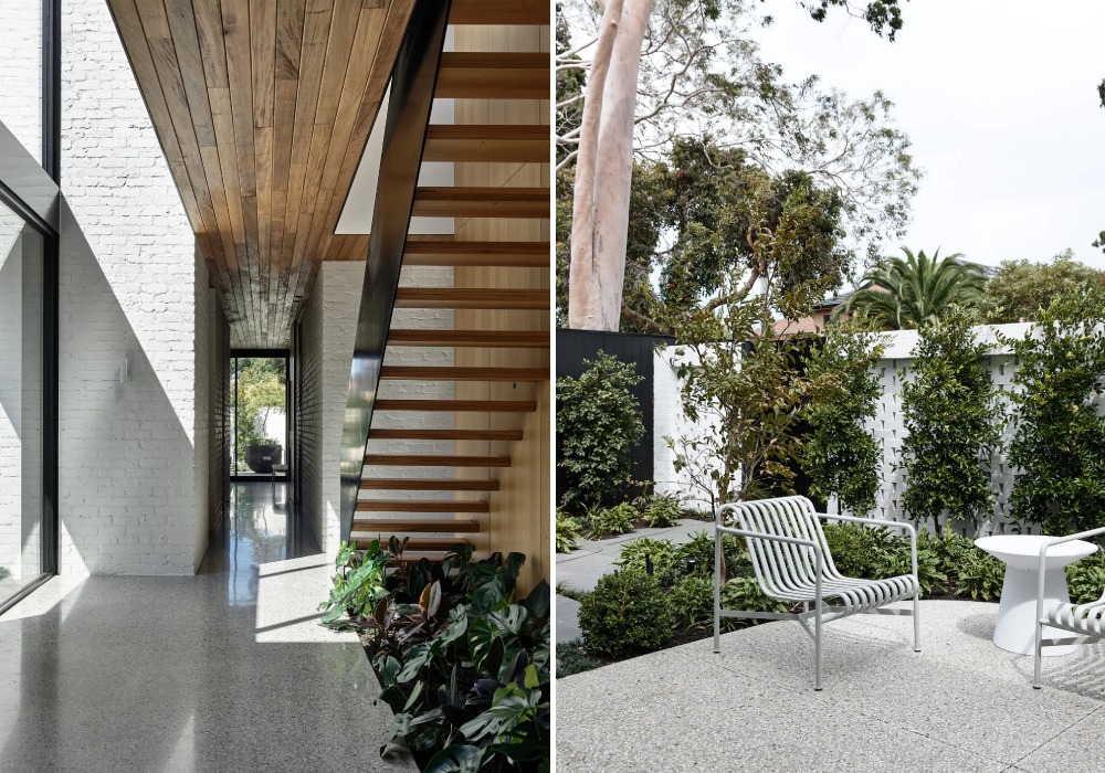 The material palette, partly inspired by midcentury modernism, accentuates the relationship between the interior and exterior spaces.