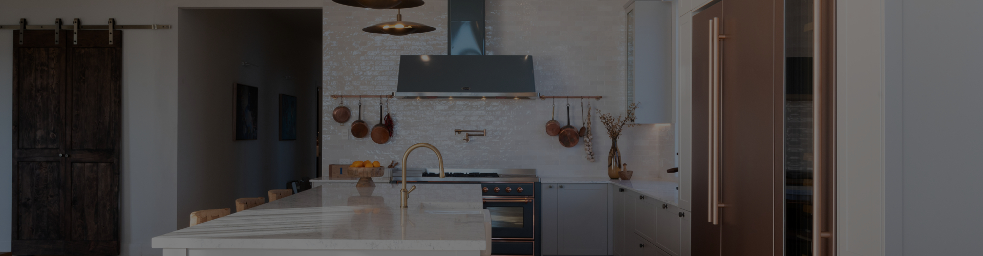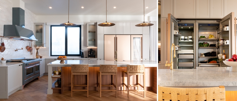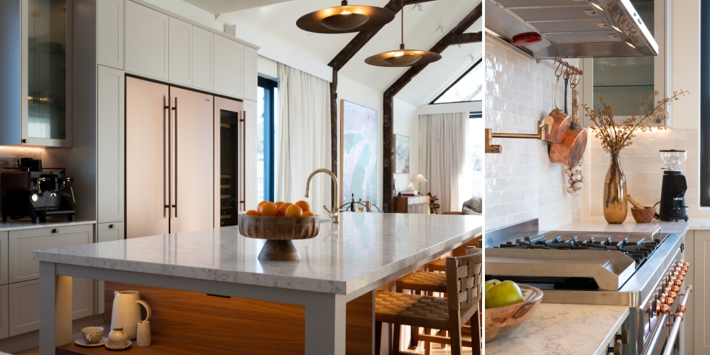 Don’t be afraid to mix and match metals to achieve the perfect tonal balance. The Fhiaba fridge in a gorgeous copper finish on the doors and handles elegantly matches the copper pendant lights, while the touches of copper on the IlVE Majestic Cooker cooktop controls and oven handles mixes beautifully with the sleek stainless steel trim. Bronze finish is introduced through the Armando Vicario tap to bring the entire look together.