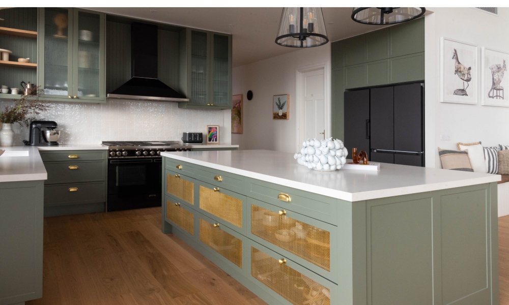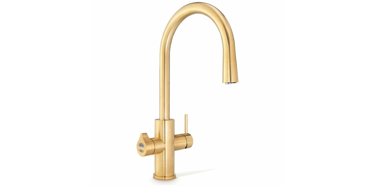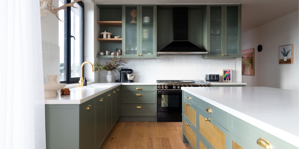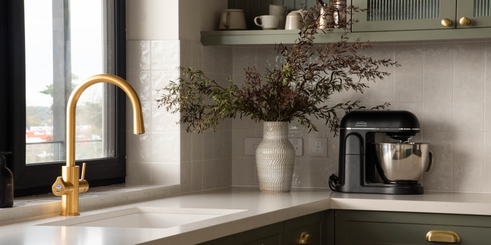 A touch of gold brings warmth and a subtle sense of opulence in the space. The Zip HydroTap in Brushed Gold complements the gold tones on the drawer handles and island benchtop. This precious metal perfectly punctuates the sage green and neutral tones within the overall colour scheme.