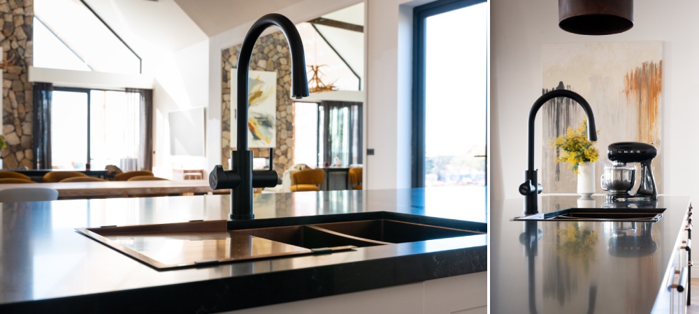 For example, in the main kitchen, they’ve opted for the Oliver Spectra Sink in a copper finish to match with the copper light pendants overhead, while the Oliver Essente Gooseneck Tap is in a black finish to flawlessly match with the black countertop.