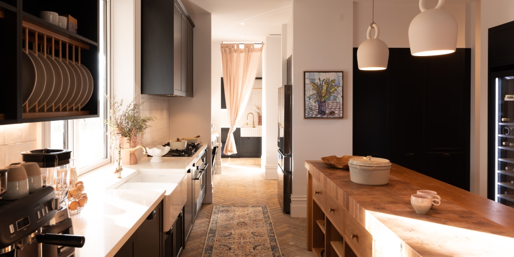 To maximise the available space, Scott Cam has placed two sinks, one one each side of the kitchen, to create dedicated areas for specific tasks.