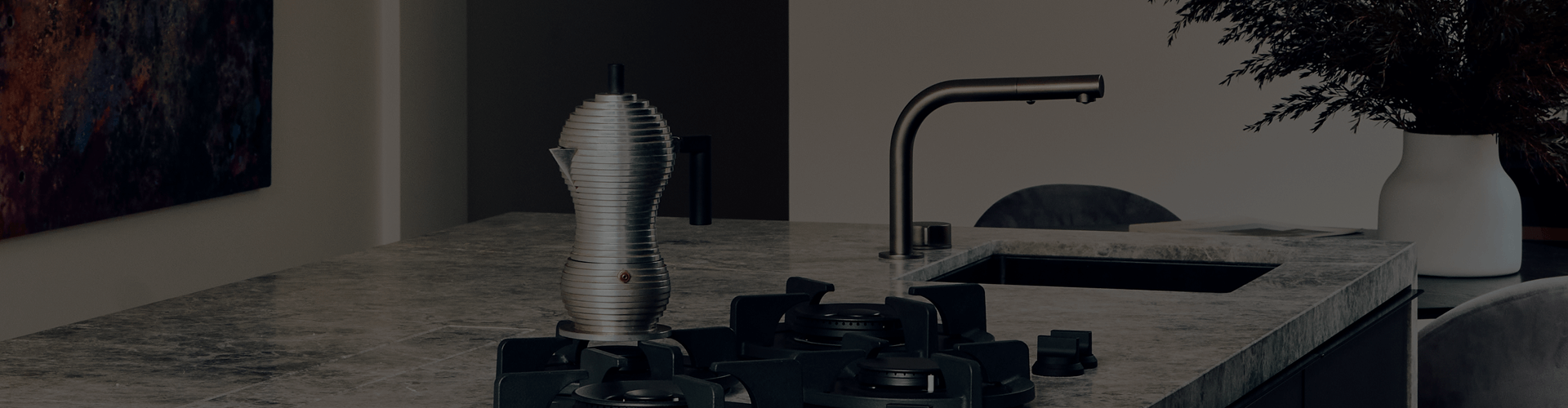 In the kitchen, a Rogerseller Eccentric Hob Sink Mixer and Outlet with Pull Out Spray forms an arresting centrepiece in combination with the adjacent Pitt Natural Gas Cooktop. The Eccentric mixer combines a distinct off-centre axis with a concealed back-plate. It displays hot and cold indicators when the handle is operated and utilises innovative German progressive cartridge technology.