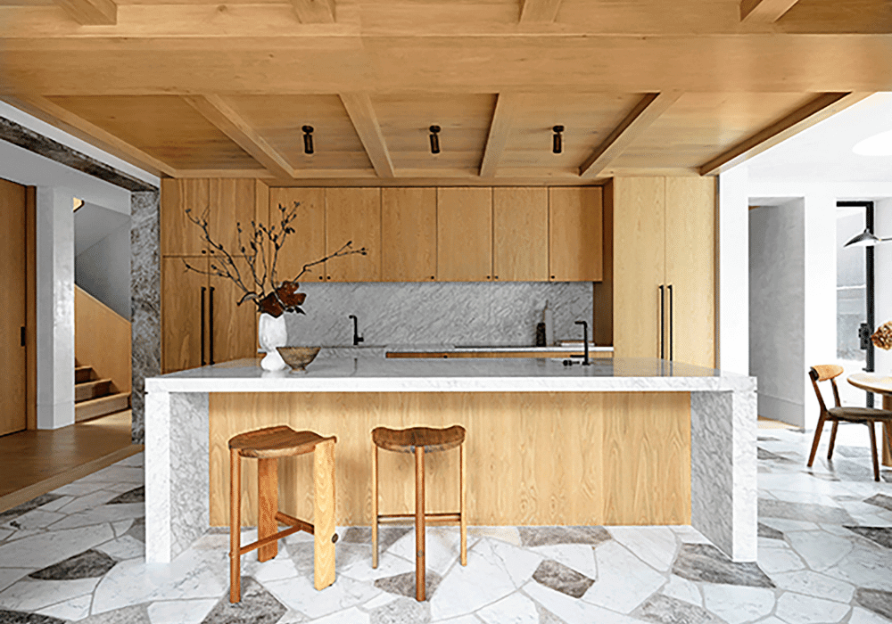 "This kitchen's design was inspired by the owners' European heritage and the architectural framework of the house," says Shelby Griffiths, the interior designer who worked on this project in conjunction with her colleague, practice director Jeremy Bull. The Carrara marble island and timber tools bring a quiet elegance while a crazy-paving floor lends the newly renovated home an 'it's been here forever' feel.