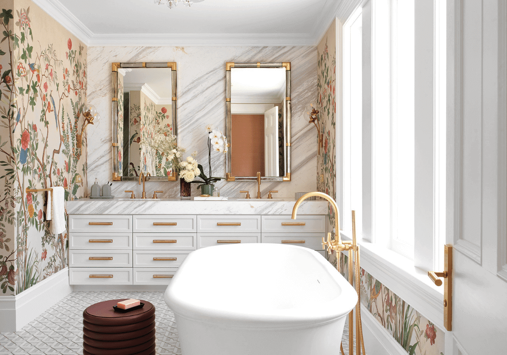 Pink-tinged Volakas marble spectacularly finishes the main ensuite of a Victorian mansion in Sydney's Inner West that's been updated by Greg Natale. A dynamism pulses through it, thanks to its exquisite Gucci chinoiserie wallpaper and Greg's signature Ponti geometric marble floor tiles. The handles, tapware and mirrors nod to the brass accents that appear elsewhere in the house, while the Kate Spade 'Dickinson' light ensures everything feels perfectly cohesive.