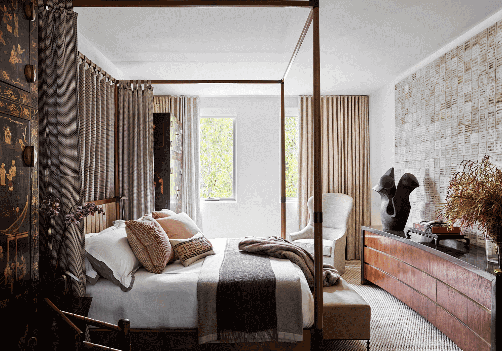 A highly tactile feature wall comprising 660 timber tiles makes its own statement, forming part of his "always expanding collection" together with two antique Chinese cabinets to lend height and exotic detail. Yet, comfort remains paramount. "Even with the drama of neutrals mixed with blacks and the four-poster bed, there is no preciousness," says Thomas. "The room remains comfortable and inviting."