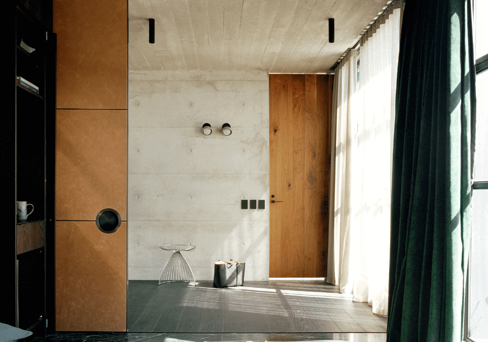 The application of materials is used to create the sensation of greater space. Leather-clad sliding walls expand and contract, mirrored surfaces create an illusion of depth – and in this main bedroom, a solid-stone bath doubles as a bedhead to free up space. Joinery cuts clutter in it and the home's other bedrooms.