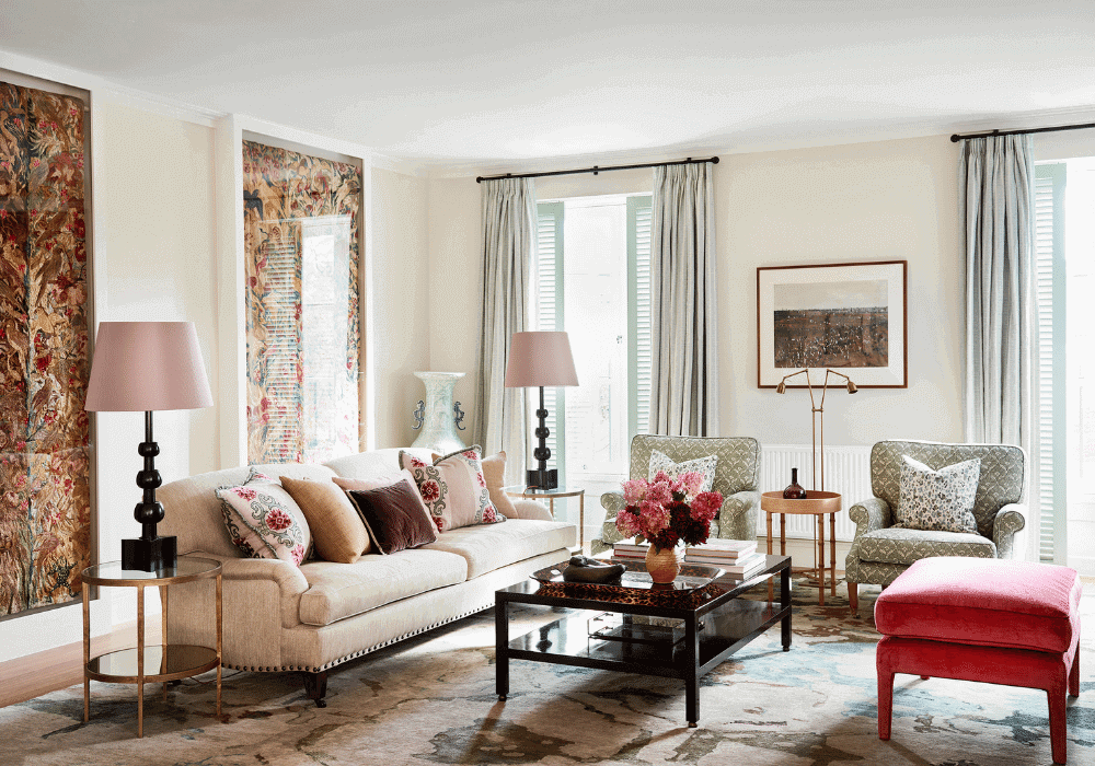 Those richly coloured and detailed floor-to-ceiling tapestries (which have been in the family for some time) take pride of place on the wall behind framed glass panels. Around them, Adelaide combined artisanal fabrics with the traditional English florals of Colefax and Fowler to produce a room that feels truly timeless. "The colours and textures add layering and richness," she says.