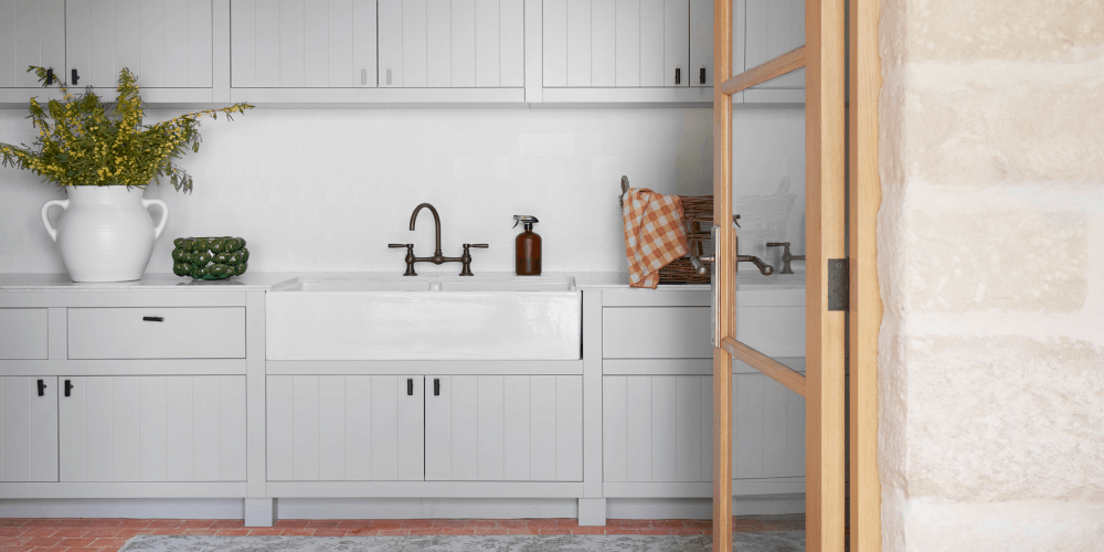 Double oak-framed glass doors in a striking arched entryway reveal this inviting laundry on NSW's Central Coast. Studio Gorman's solution includes ample storage, V-groove finish cupboards, and two washers and dryers, blending aesthetics with functionality, as described by Suzanne."