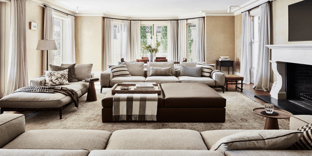 Kate Nixon and her team were entrusted with updating furniture and soft furnishings in a grand Sydney home's formal lounge. They aimed to complement the existing architecture and family's treasures. The centrepiece is an over-scaled leather ottoman, connecting custom Flexform Gregory sofas and a vintage rug. Elegant sheers filter garden and harbour views, creating a timeless, comfortable, and sophisticated ambience.