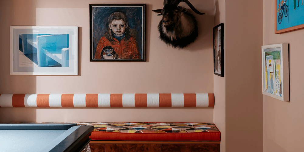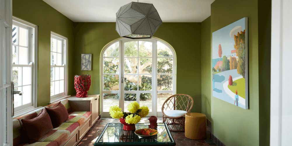 Inspired by Michael Muir's candy-coloured artwork, Hugh-Jones Mackintosh used a custom green paint to transform this sunroom, mirroring the garden's hues outside the 1920s heritage residence. With vibrant furnishings, the room offers a tranquil retreat from the city's bustle while maintaining a muted yet warm base palette.