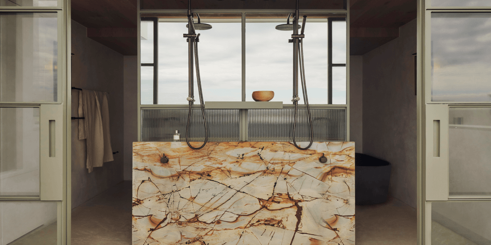 Stone, concrete, and wood panelling blend seamlessly to fulfil the owners' request for a tranquil sanctuary in this Sydney Eastern Suburbs main ensuite. Designed by SE DÉA, the space combines coastal and city elements, incorporating wabi-sabi elements for a serene atmosphere, leading to a relaxing sauna.