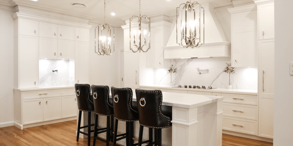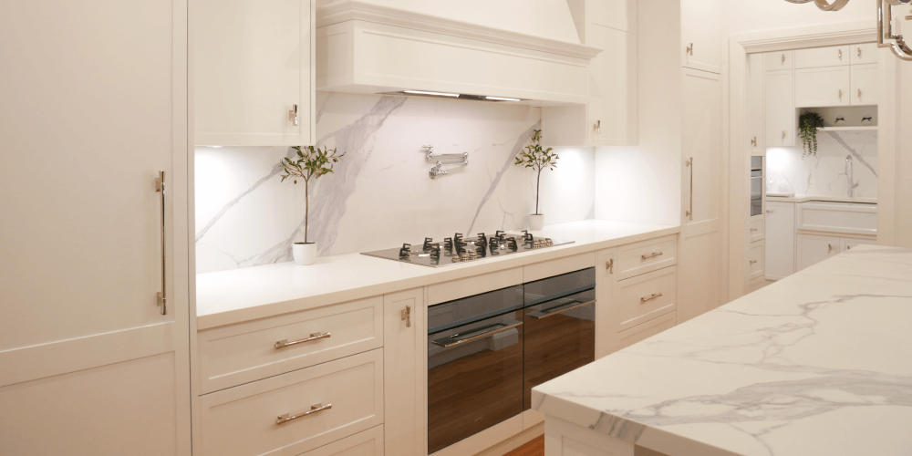 Harmer’s stunning design also includes the anchoring vision of a slimline shaker door with a twist, which perfectly complements the room’s grand scale and high ceilings. The large, tapered Falmec rangehood and beaded island cabinetry further enhance the overall sophistication of this sublime space.