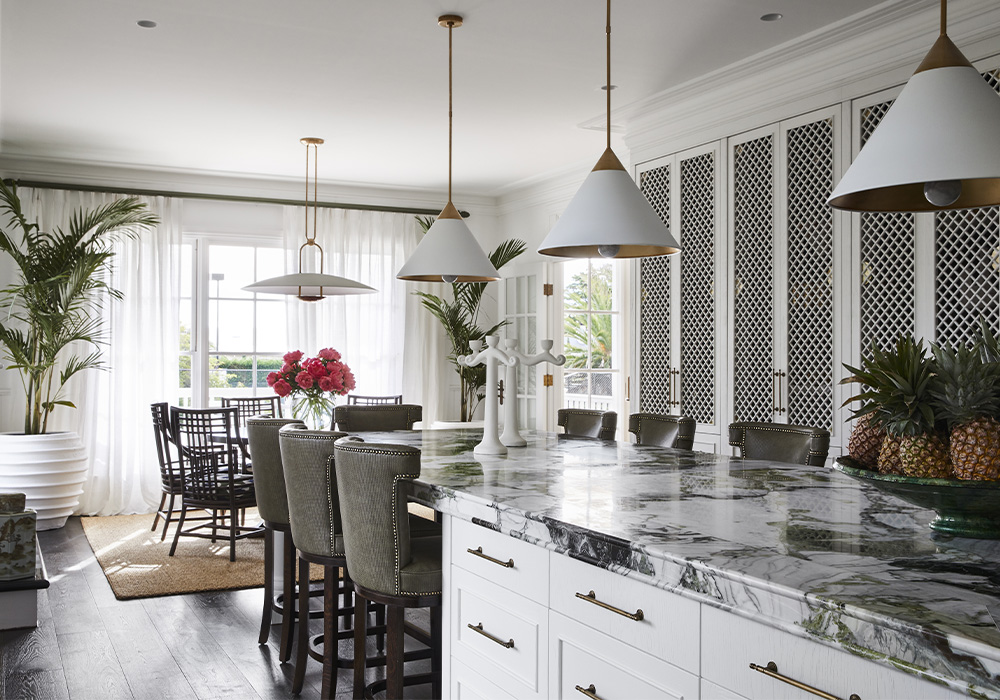 “After the much-loved renovation of my last home, Beechwood, which was a successful journey both personally and professionally, embarking on the renovation of my new home was exciting. I wanted to further showcase the power of a carefully thought-through renovation. It is extraordinary what you can achieve when you can see what a property can become with the right vision.I found the ideal house in the most glorious location, in Mt Martha on Victoria’s Mornington Peninsula. Like Beechwood, the property had been on the market a long time without an offer. I questioned myself again, wondering why no one had bought it. Then I realised no one else could see what I had seen as soon as I laid eyes on it.The style that immediately came to mind was British Colonial, but being so close to the Port Phillip Bay I wanted to add more of a luxe coastal hotel feel, with a Floridian/island vibe.Biscayne showcases Caribbean Colonial, a result of our desire to elevate existing styles to a whole new level and create a beautiful formality blended with a relaxed conviviality. It’s a look that reflects my desire to be at one with nature, and to bring the outside indoors — in a fresh, new way. The house itself (previously known as Fontainebleau) had great bones and had been built really well.It had some fabulous architectural features, like 3m ceilings, an incredible staircase and a great floor plan, but it needed some major reworking in terms of space planning; for example, the kitchen was in the darkest corner of the house, which doesn’t suit the kind of lifestyle we look for today.