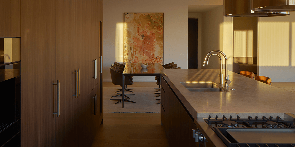 The matched Miele suite also includes handy warming and vacuum drawers, a Vitroline Built-In Coffee Machine and a pair of bottom-mount fridges complemented by a Liebherr 80-Bottle Vinidor Built-In Wine Storage Cabinet.