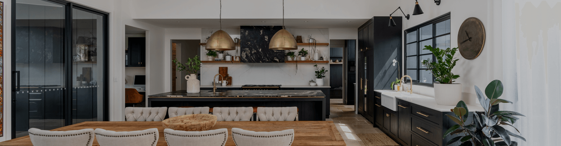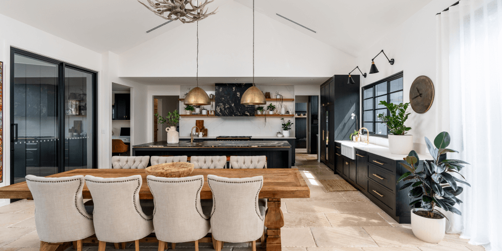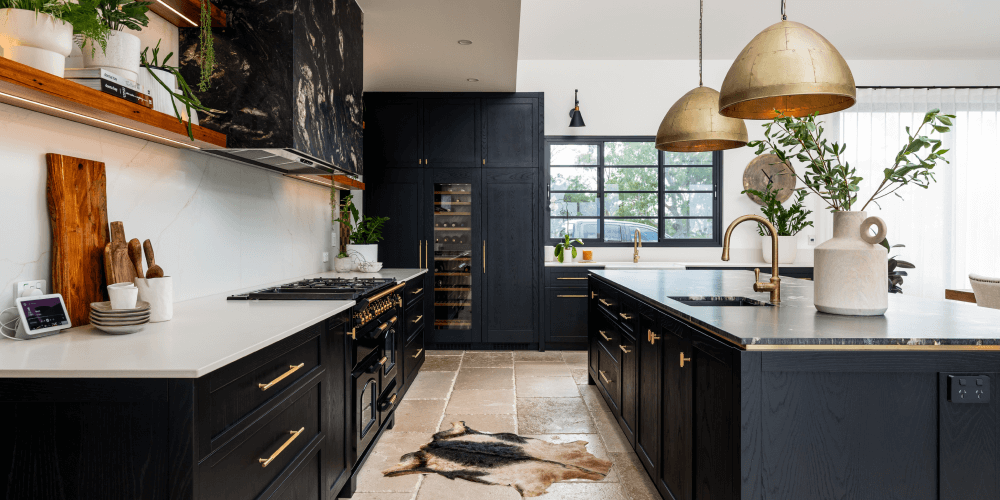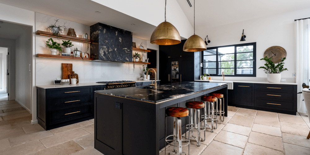 Stunning black cabinetry and brass fixtures combine with a modern farmhouse style.