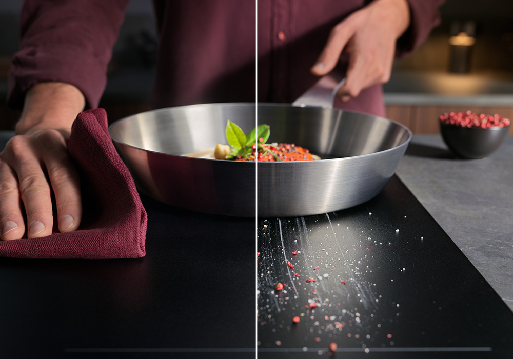 The AEG SaphirMatt surface is more than a design feature, it’s a sensory experience. With its deep matte black finish and unique texture, it softens reflections to create a refined surface that integrates into a modern kitchen, and offers a subtle and sophisticated alternative to glass cooktops. Unlike traditional induction cooktops with glossy surfaces that easily show smudges and fingerprints, the SaphirMatt finish stays beautifully understated and remarkably easy to clean. Its textured surface withstands daily wear, maintaining a clean, sophisticated look that endures.