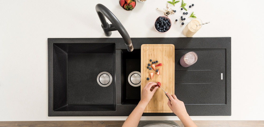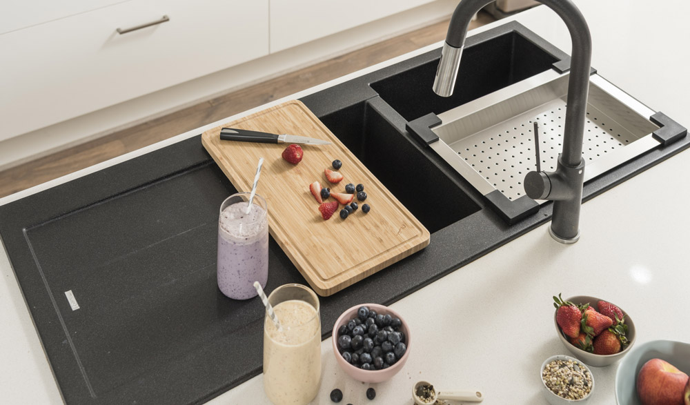 Oliveri bamboo boards fit into the bowl of the sink to create extra preparation space.