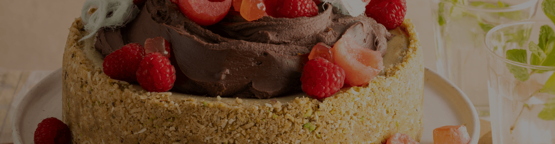 - To serve, whip the chilled ganache for 2 minutes, or until it lightens in colour and texture. Release the cake from the pan and place on a serving plate. Spoon over the whipped ganache and decorate with raspberries, watermelon, Turkish delight and fairy floss.