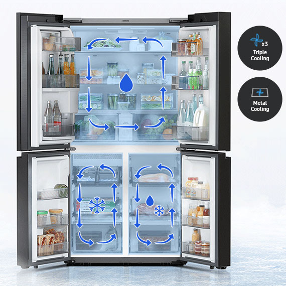Keep food fresh for long and preserve its flavour and taste. Triple Cooling independently controls the temperature and humidity in 3 compartments and prevents odours from mixing. The Metal Cooling plate helps keep the air cooler for longer.