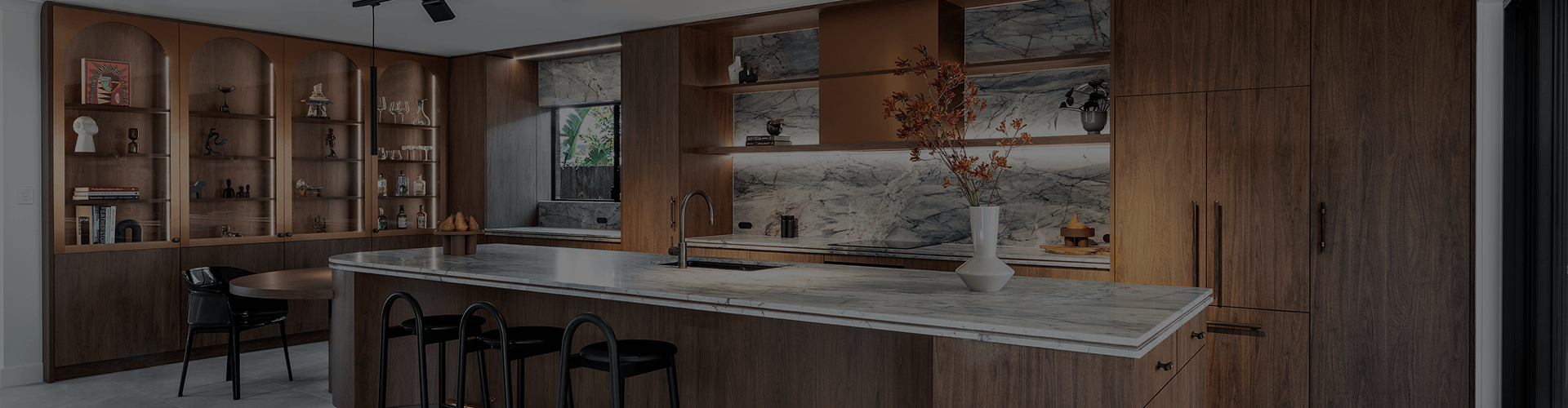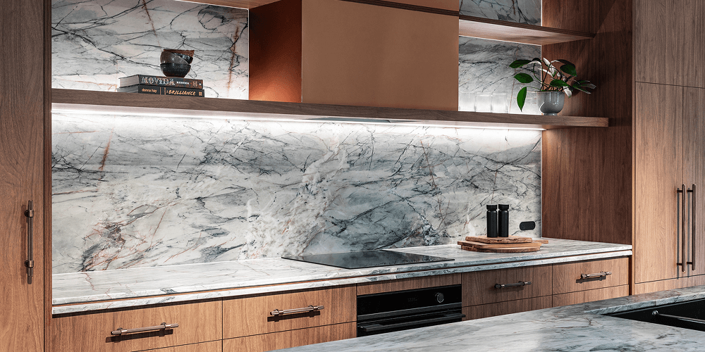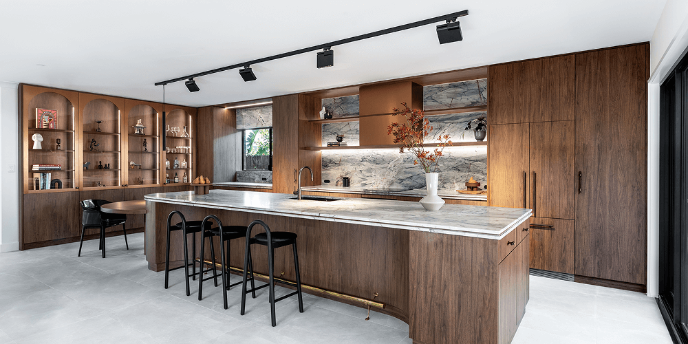 A striking feature are the surfaces and splashbacks of Ijen Blue Quartzite that not only add visual drama, but also balance the warmth of Florentine Walnut joinery along with subtle highlights of brushed brass.