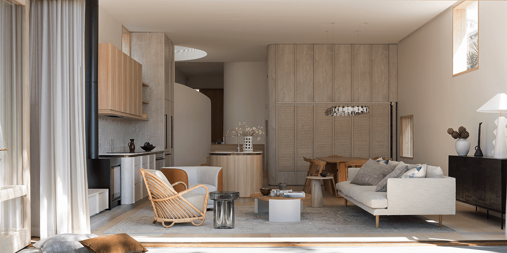 Neutral interior tones complement a soft white bagged brick exterior that instantly evokes a distinct beachfront vibe. It’s a style that resonates strongly with the Australian lifestyle and a desire to connect with nature.
