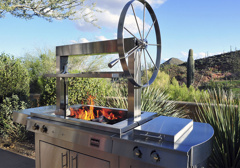 If you’re really looking to impress, the Kalamazoo Gaucho Grill is power-incarnate. Featuring Kalamazoo's powerful brass dragon burners, a flywheel for height adjustment, and a powerful rotisserie spit, your cooking options are endless. The Gaucho grill is designed to cook with wood, charcoal or gas on its own. The grill experts at Kalamazoo understand the pain of getting a reliable wood or coal fire going, which is why the Gaucho features dragon burners below the firebox to to easily light your chosen fuel.