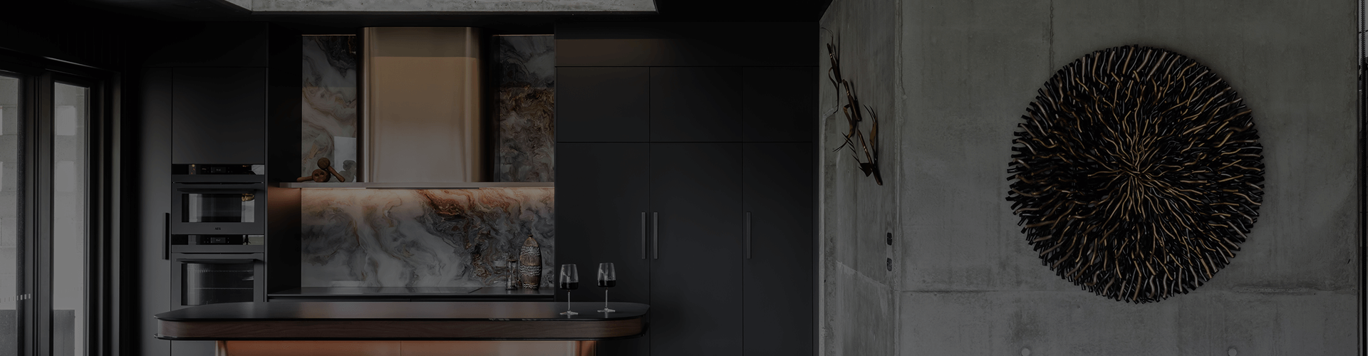 The striking incorporation of a raw concrete wall and polished concrete floors offer an industrial-style juxtaposition to the dramatic ambience of dark cabinetry and countertops.