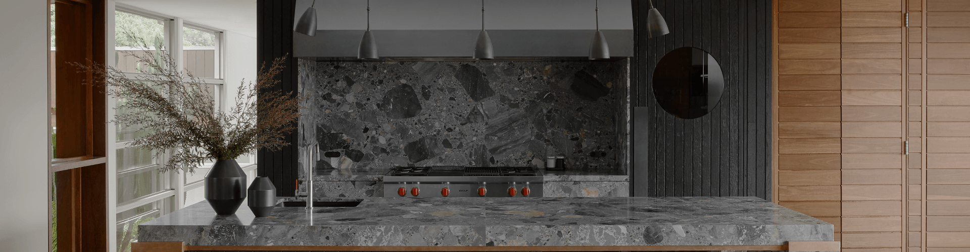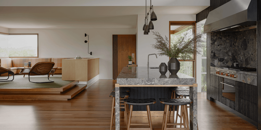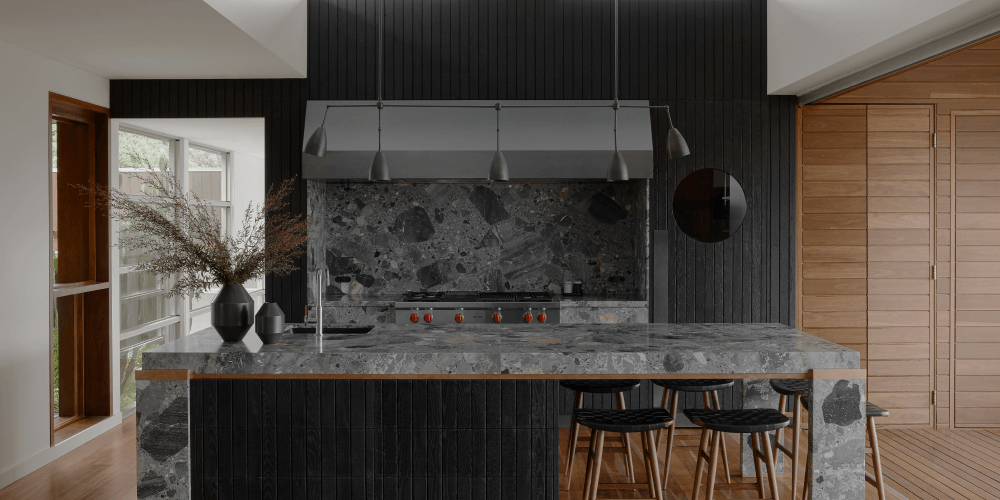 Building on existing mid-century modern architecture, this tallowwood kitchen boasts refined details and striking character with unique materials such as Canova marble, shou sugi ban-charred timber-cladded joinery, and a Qasair Murray Wall Mounted Rangehood in hot rolled steel.