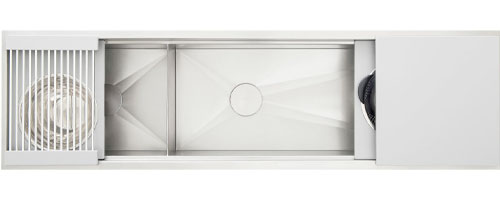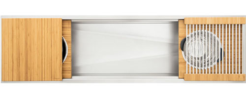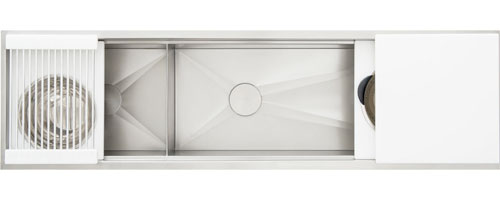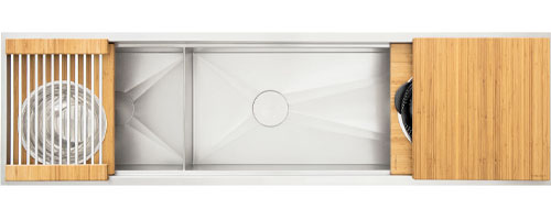 Each Galley Workstation is handcrafted in the USA, fabricated from one piece of 316L 16-gauge stainless steel, so you know it can withstand the rigours of life in a hectic kitchen. You can choose from four Culinary Kit finishes: Exclusive Gray Resin, Designer White Resin, Natural Golden Bamboo, and Graphite Wood Composite. A unique Angel Finish was developed to soften the traditional high-sheen appearance of stainless steel. This surface resists water spots and obscures minor grazes. If you do scratch the bottom of your Galley, the Angel Finish is completely restorable with the assistance of a trained professional.
