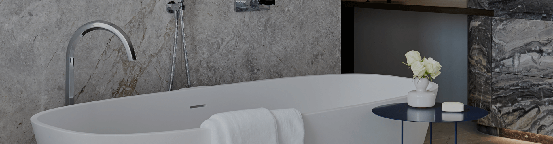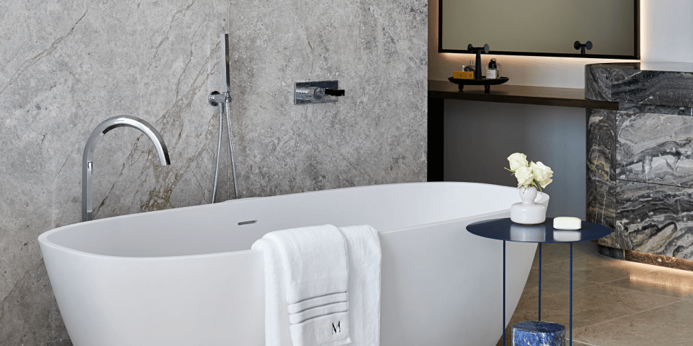 The option of a freestanding Skye 1700 bath in Dover White from Claybrook will elevate relaxation. Manufactured in high-performing Marbleform stone in an eco-friendly process, it provides a timeless look while delivering space efficiency for a long, rejuvenating soak.