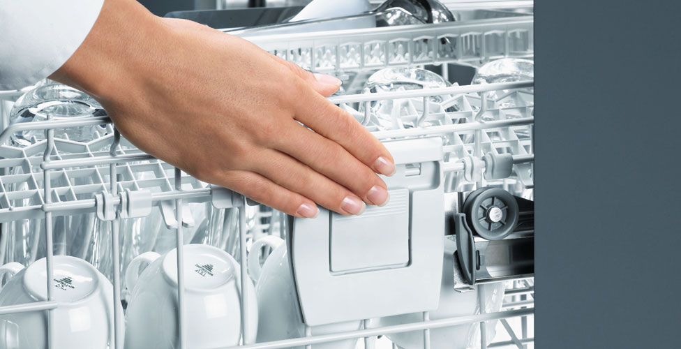 “Plus” stands for 14 standard place settings, the optimum quantity for use with the large-capacity dishwasher. Other advantages of the new tray design are the height-adjustable side elements on each side, and an extra rack element that can be clipped into place to take long-stemmed glasses.