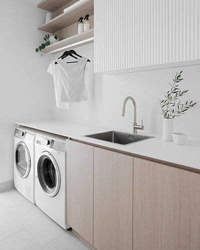 If you’re looking to maximise your laundry footprint, opt for a front loader washing machine, which allows you to utilise the space above with a benchtop. You can also incorporate storage space above, such as a cupboard or open shelving, without being restricted by the lid on a top loader washer.
