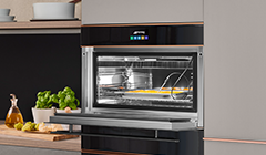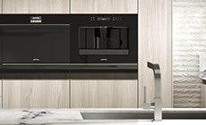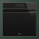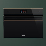 Smeg Dolce Stil Novo is defined by its black eclipse glass and copper accents, a combination that gives the range a distinctive depth and character. The collection spans ovens, combi-steam and microwave ovens, cooktops, rangehoods, coffee machines, wine coolers, and specialised drawers. Each piece is designed with aligned proportions and matching details, so when brought together they form a complete suite of appliances with a clear and consistent identity.