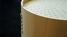At the heart of each design is the distinctive perforated tabletop, offered in sheet metal, wood, or leather. Echoing the patterns of traditional sieves, these intricate perforations add depth and character while enhancing the table’s versatility. The curved base, also available in wood, metal, or leather, is seamlessly held together by refined hide leather stitching, an artisanal detail that speaks to Amura’s dedication to meticulous craftsmanship. The interplay of materials and textures creates a compelling balance between industrial precision and organic warmth.