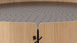 At the heart of each design is the distinctive perforated tabletop, offered in sheet metal, wood, or leather. Echoing the patterns of traditional sieves, these intricate perforations add depth and character while enhancing the table’s versatility. The curved base, also available in wood, metal, or leather, is seamlessly held together by refined hide leather stitching, an artisanal detail that speaks to Amura’s dedication to meticulous craftsmanship. The interplay of materials and textures creates a compelling balance between industrial precision and organic warmth.