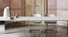 The Amura Vienna Chair blends timeless form with modern refinement, reimagining the iconic tubular metal chair through the lens of expert Italian craftsmanship. Thoughtfully designed details, such as the leather belt supporting the backrest and the soft drape concealing the crossbar, enhance both function and aesthetics.