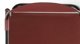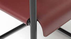 Upholstered in Cuoio Leather 15, its deep dark red tone exudes warmth and sophistication, creating a striking contrast against the sleek black metal frame. This carefully curated combination enhances both the chair’s visual impact and its timeless appeal.
