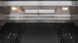 The porcelain enamel cast iron hotplates and split grills guarantee durability and easy cleaning, while the LED lights on control panel dials and halogen lights on the splashback provide perfect visibility during evening cooking sessions. For added safety, the flame failure gas shutoff ensures that the BBQ is shut off if the flame goes out. The stainless steel elevated cooking rack allows for versatile cooking, while the full-width oil and fat catchment tray on telescopic rails ensures easy cleaning and maintenance. The double-layered 304 grade stainless steel roasting hood with glass viewing window and integrated temperature gauge allows you to cook your food to perfection every time.