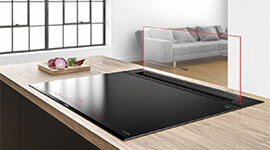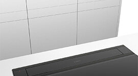 One of its standout features is the decorative LED illumination of the retractable glass panel. This not only adds a touch of sophistication to your kitchen but also provides atmospheric lighting that sets the mood for your culinary adventures. With Guided Air technology, you can say goodbye to worries about pot height and position. This downdraft ventilation system ensures perfect extraction performance no matter where your pots and pans are placed on the cooktop. Bosch's Cook2Hood control further simplifies your cooking experience by allowing convenient control of the Glass Draft Module functions directly from your cooktop. And with EcoSilence Drive, you get a powerful yet energy-saving drive that ensures your kitchen stays fresh and comfortable.