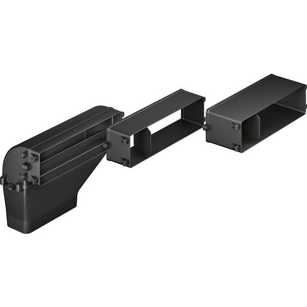 This kit includes 3 mountable depth adapters (40mm, 80mm, 120mm) for different worktop depths from 600mm to 750mm, 90° diverter element, and connector element for continuation with 220mm x 90mm flat ducting.