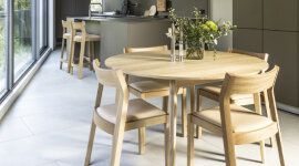 | Material | Solid oak or walnut frame. Oak or walnut veneered top and leaves. Felt-lined storage compartment for leaves. Mechanical bearing extension system. Clear polyurethane lacquer. |