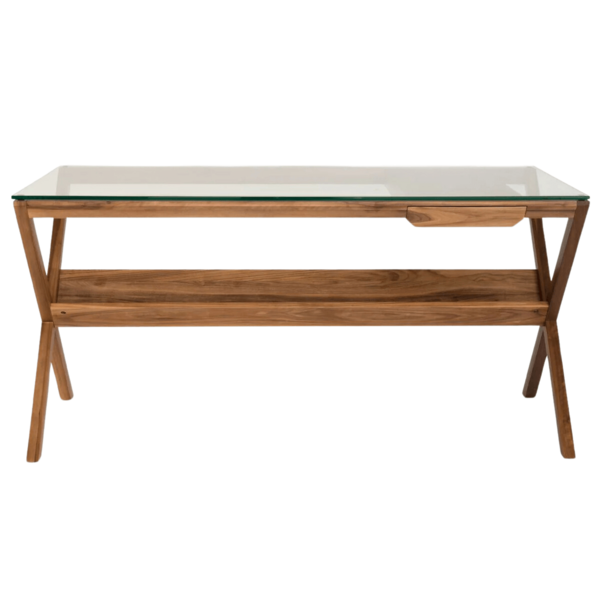Perfectly blending style and functionality, the Covet Desk's clean and simple lines make it an ideal choice for those seeking a contemporary yet practical workspace. The natural timber construction ensures durability, while the tempered glass surface adds a touch of modern elegance. Whether crafted from oak, which may darken over time, or walnut, which may lighten, this desk promises to maintain its beauty and functionality for years to come, adapting gracefully to the changing light and environment of your home office.