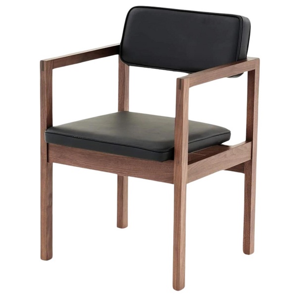 The West Street Armchair features a solid wood frame with upholstered leather pads on the seat and back, providing exceptional comfort. The slightly angled back pad enhances relaxation, making it an ideal choice for both desk and occasional seating.