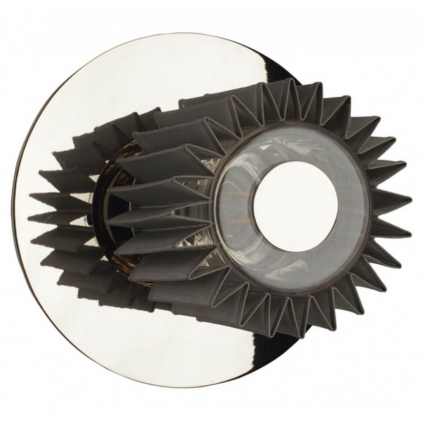 Available as both wall and ceiling-mounted fixtures, each piece in the collection radiates soft, golden or silver-toned light, casting delicate shadows that dance across surfaces and ceilings. The result is a festive and atmospheric illumination that transforms any room into a stage of light and texture. The lights combine refined metallic finishes with translucent mesh elements—an architectural signature of Perrault’s practice. This mesh not only diffuses light with precision but also adds an ethereal, almost invisible structural quality that softens the industrial core of the design.