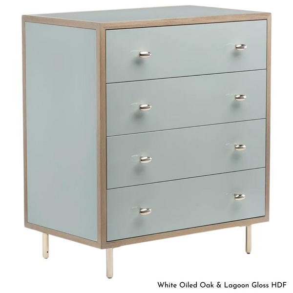 | Material Notes | Natural colour and grain variations in every plank make each piece an individual. Traditional wood joinery bonded with wood glue ensures structural integrity. All finishes are non-toxic and applied by hand, sprayed or rubbed. Drawer interiors are made from basswood, a blond timber with outstanding stability in varying climates, ensuring a smooth-running function. Drawers are detailed with dovetail joinery and a soft-close mechanism. Legs and drawer pulls in polished bronze. |